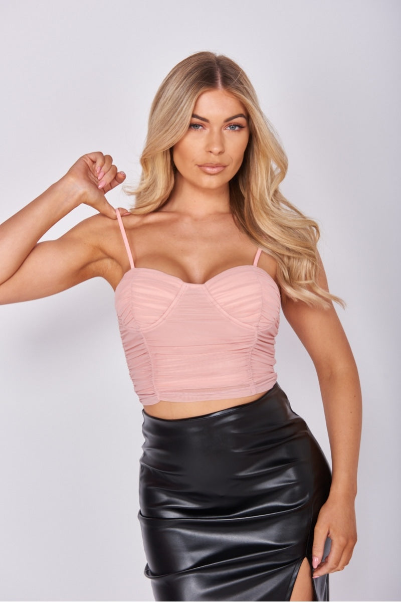 Pink Lace Up Front Ruffle Trim Bandeau Crop Top